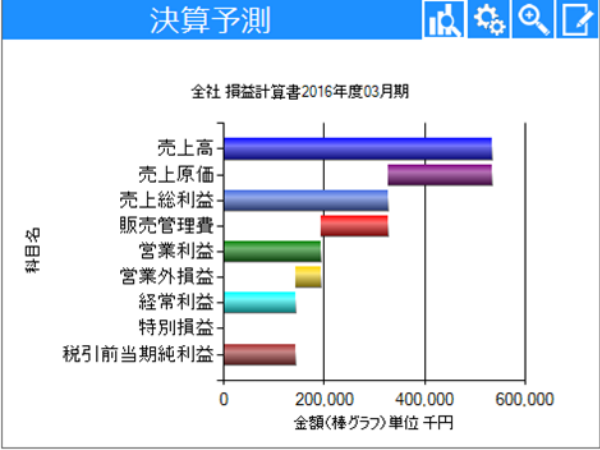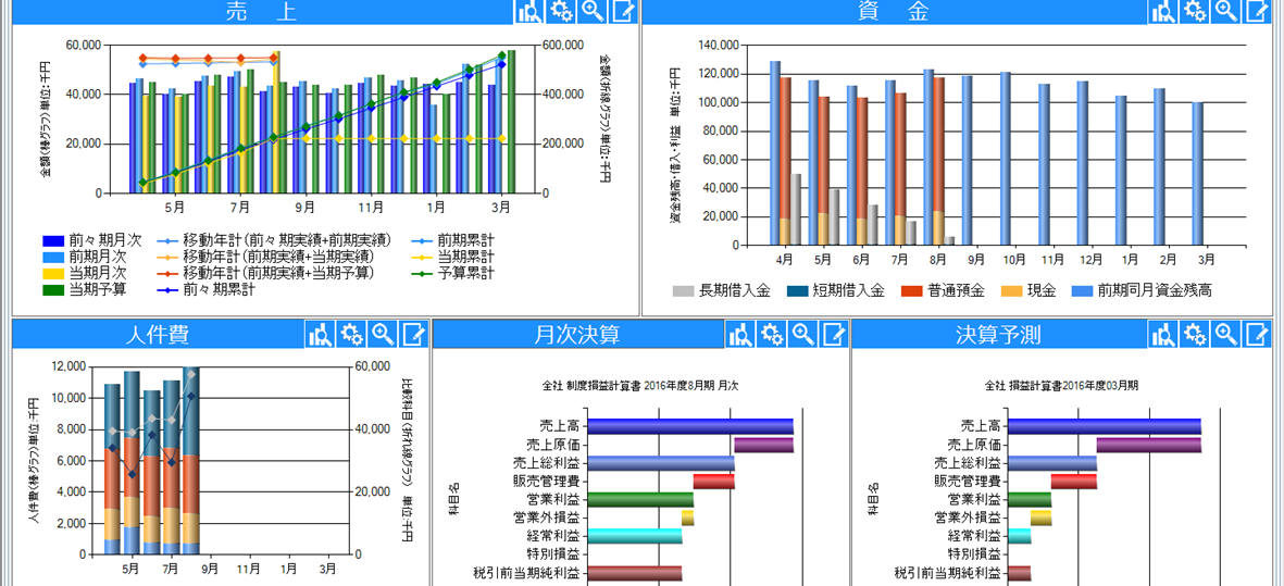 売上や手元資金、借入金、人件費といった主要な項目の推移や、月次決算、決算予測をグラフで一覧表示しますので、