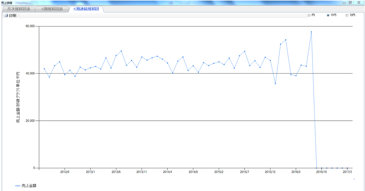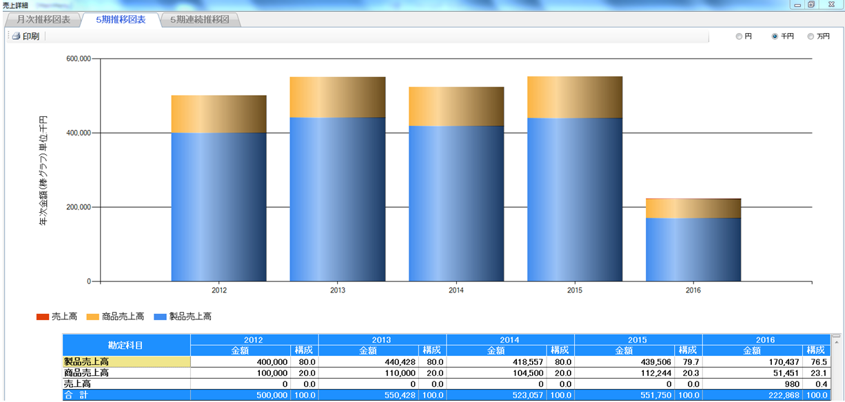 5期連続推移図では、過去5期間の売上の推移をグラフ化します。ここでは、5期間という中長期的な視点で売上の推移を把握しましょう。