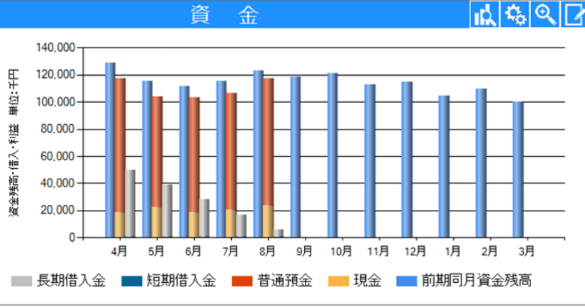 毎月末の現預金、借入金残高を棒グラフで表示します。
