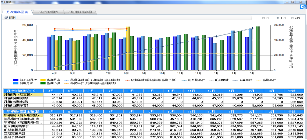 売上高の「当期実績」、「当期予算」、「前年実績」、「異動年計」について、月別推移を棒グラフと詳細な数値で確認できます。