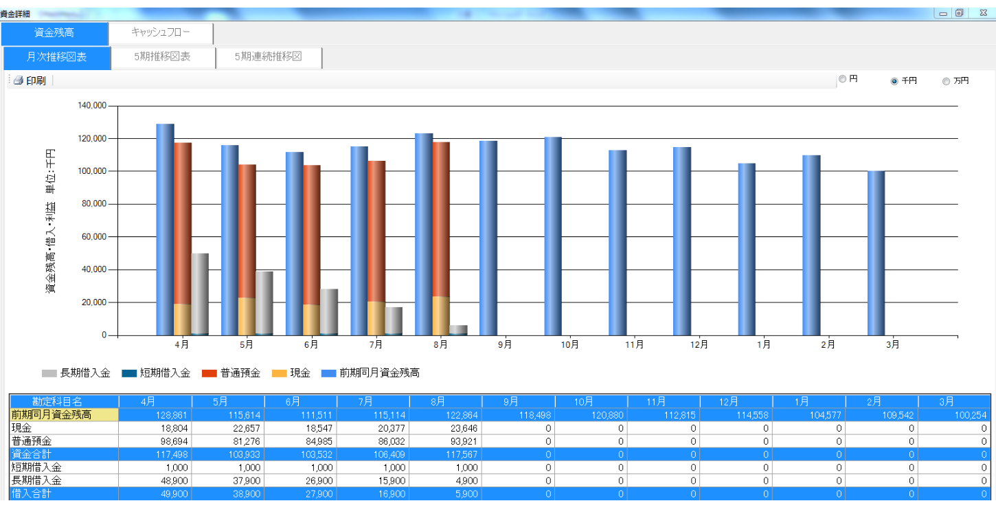 毎月末の現預金、借入金残高を表示します。今後の資金繰りに問題がないか検討しましょう。科目ごとに推移の確認もできます。