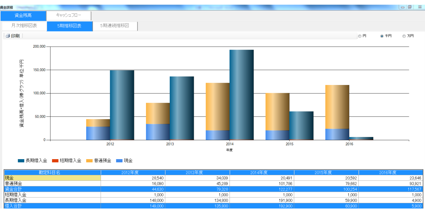 5期連続推移図では、資金と借入の残高を折れ線グラフで表示します。ここでは、半期ごとの資金と借入の推移を確認しましょう。