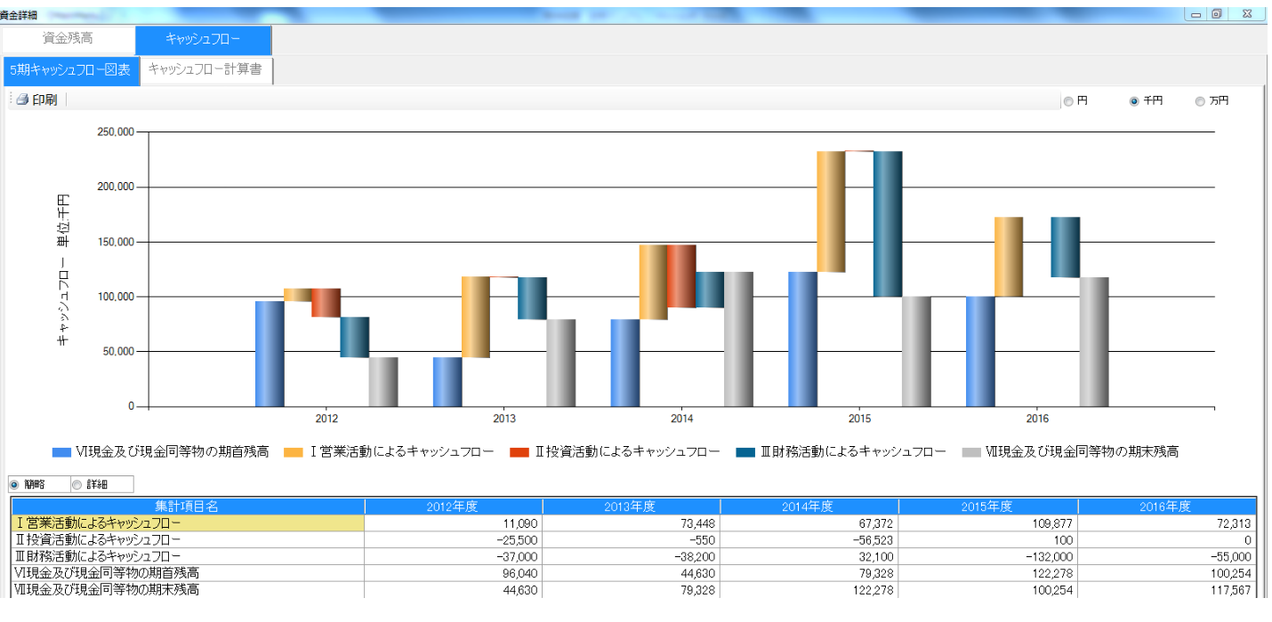 5期キャッシュフロー図表では、活動内容ごとのキャッシュフローの推移を確認できます。