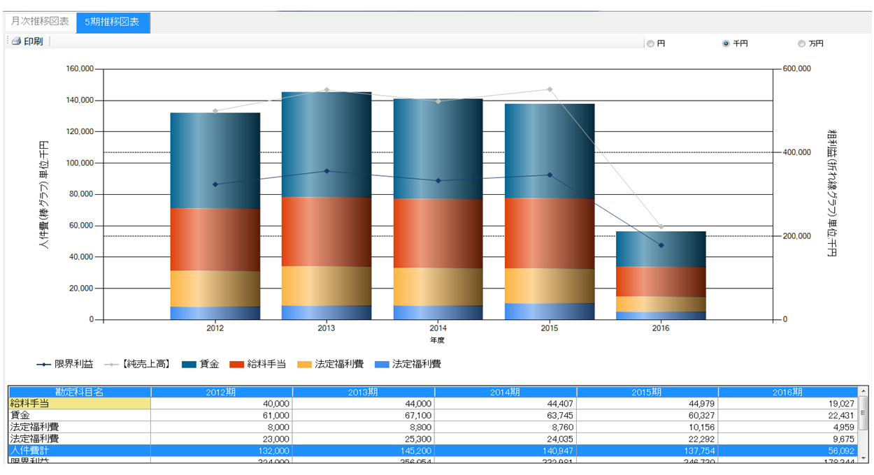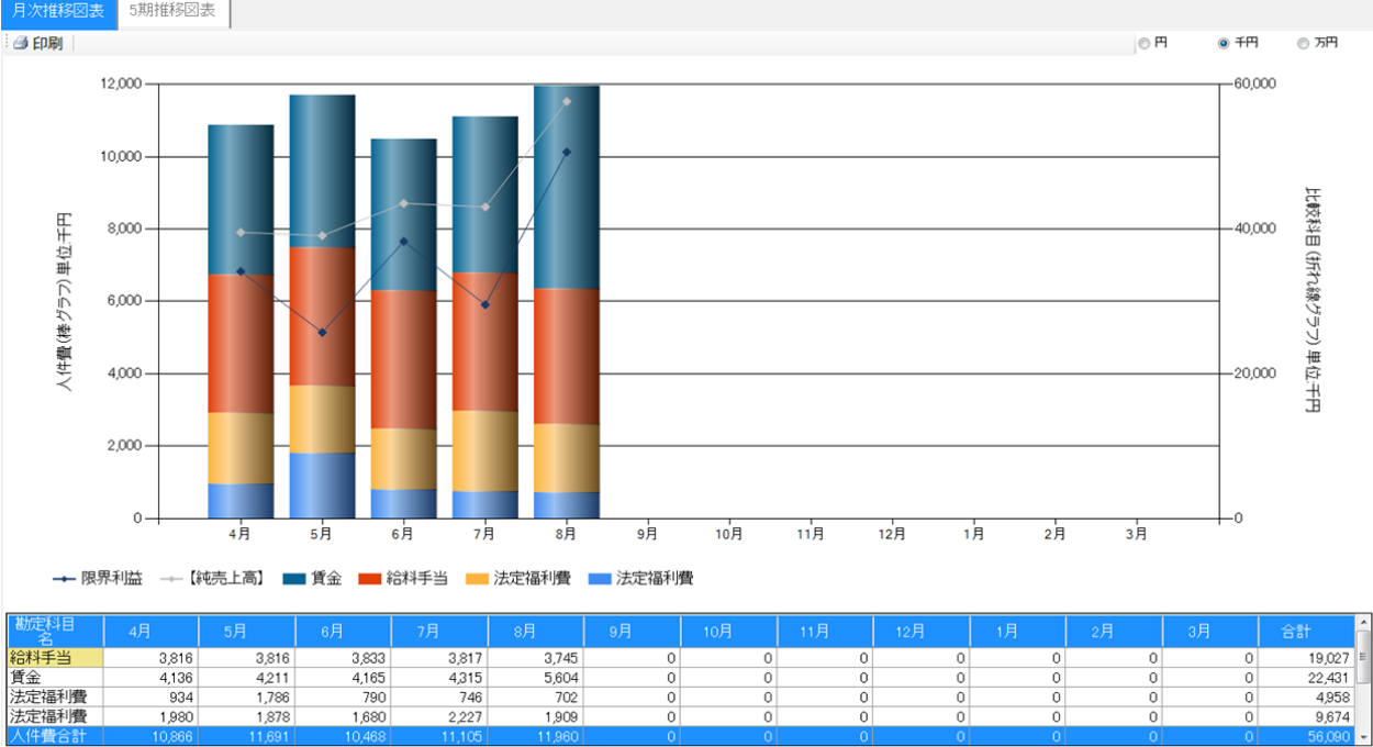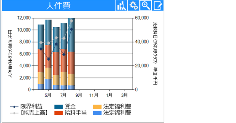 限界利益と人件費の推移をグラフで表示します。選択科目設定で、表示する科目の変更ができます。