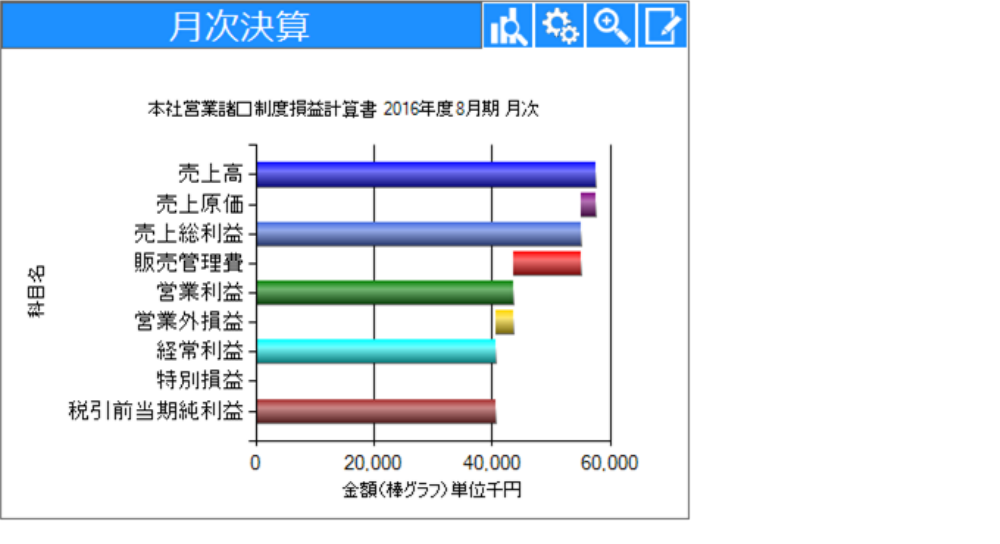 売上高の「当期実績」、「当期予算」、「前年実績」について、月別推移を棒グラフで確認できます。当期実績を基準として、当期予算及び前年実績との比較を