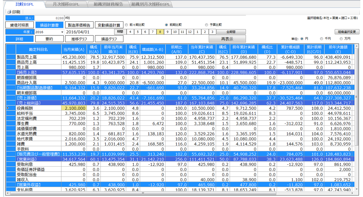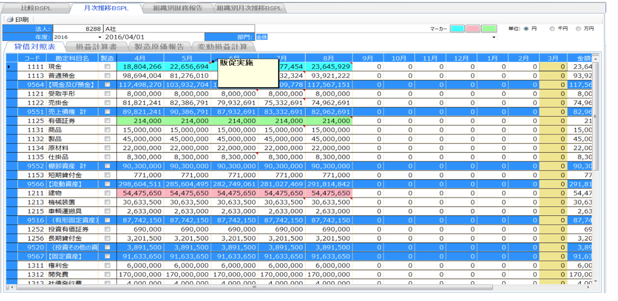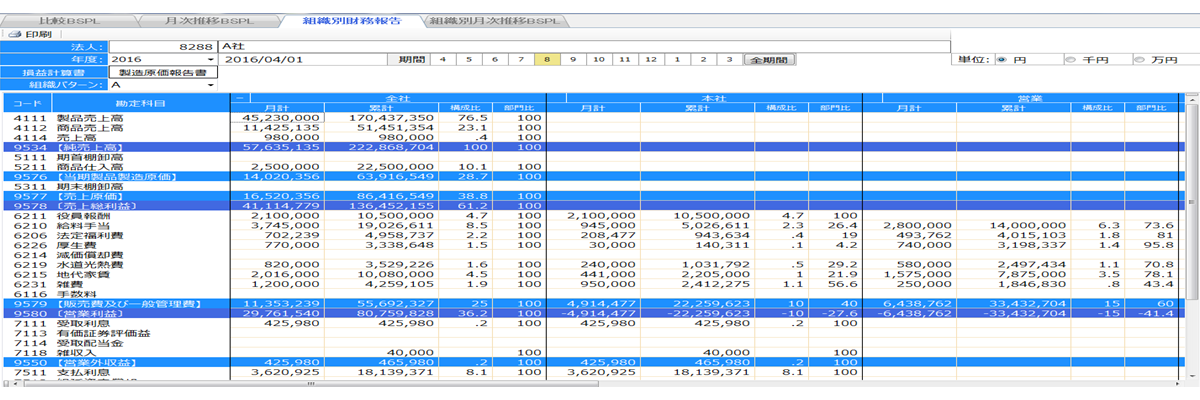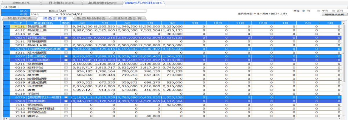 組織別財務報告 組織別月次推移BSPL