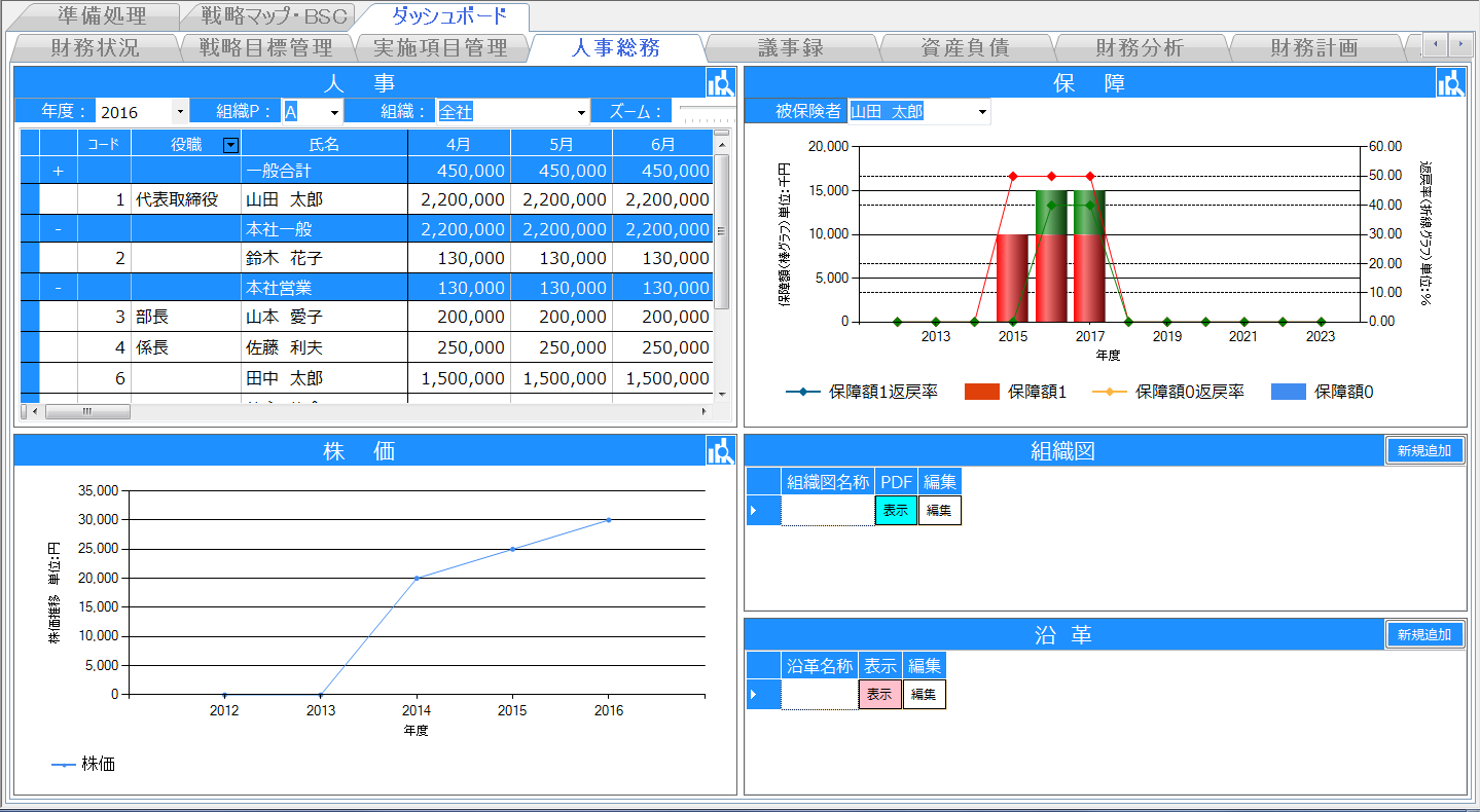従業員の給料や自社株、契約している保険をこちらで一元管理しましょう。