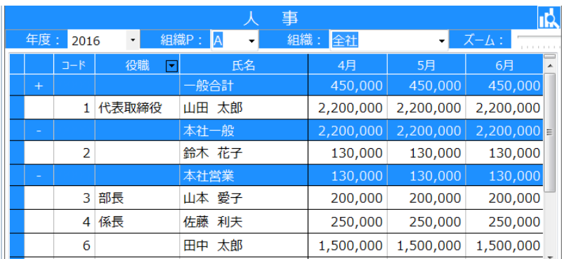 人件費の推移や前年以前との比較ができます。役職や部門の設定をしていれば、役職ごと、部門ごとの集計ができます。