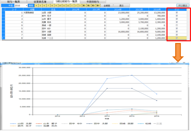 直近5期間の給与を一覧で表示できます。グラフにチェックをつけると、給与の推移をグラフ化できます。