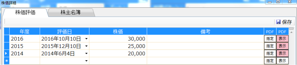 株価を評価した年度ごとに、年度・評価日・株価を一覧で管理できます。