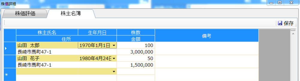 株主の管理ができます。持株数や株価について、一覧で管理できます。