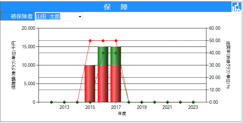 登録した被保険者毎に、保障額と解約返戻率の推移をグラフ化できます。