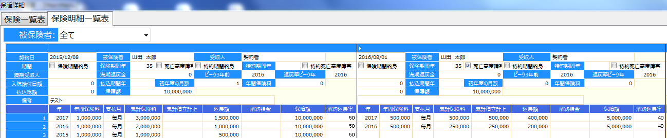 保険一覧表の入力が終わったら、保険明細一覧表を開きましょう。登録した被保険者ごとに集計をかけることができますので、誰がどんな保険に加入しているのかひと目で