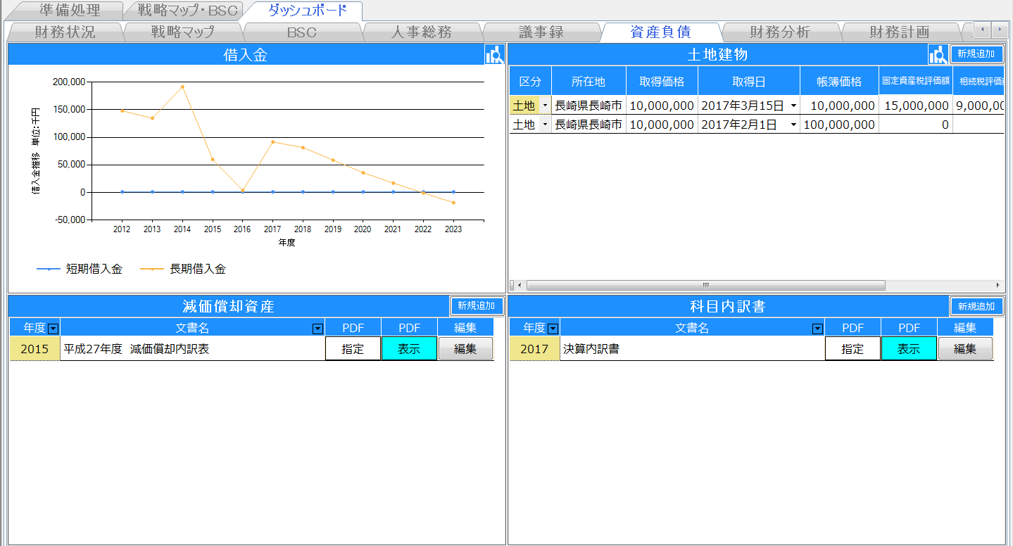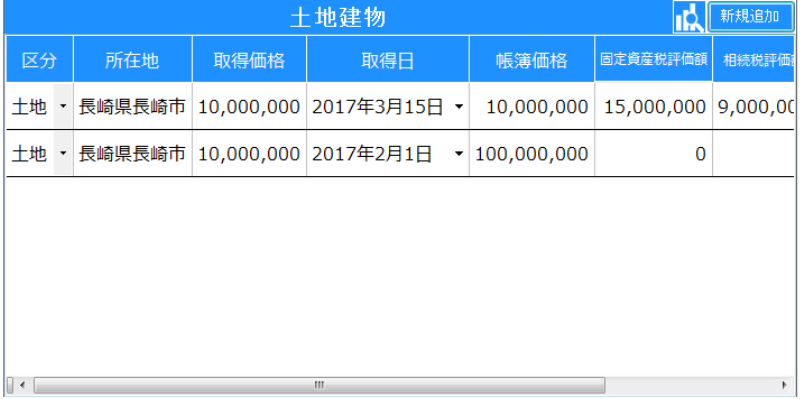 会社が保有する土地と建物を、帳簿の価格だけではなく、固定資産税評価額、相続税評価額等が登録できます。売却、相続、贈与等固定資産の所有者が変わる際にスムーズな対応ができるようにしましょう。