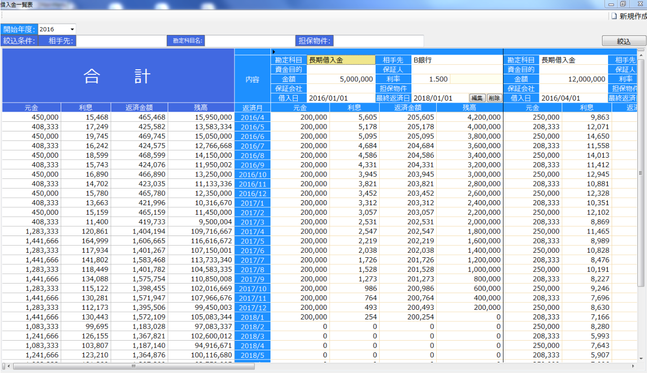 借入先、勘定科目、担保物件ごとに集計もできます。