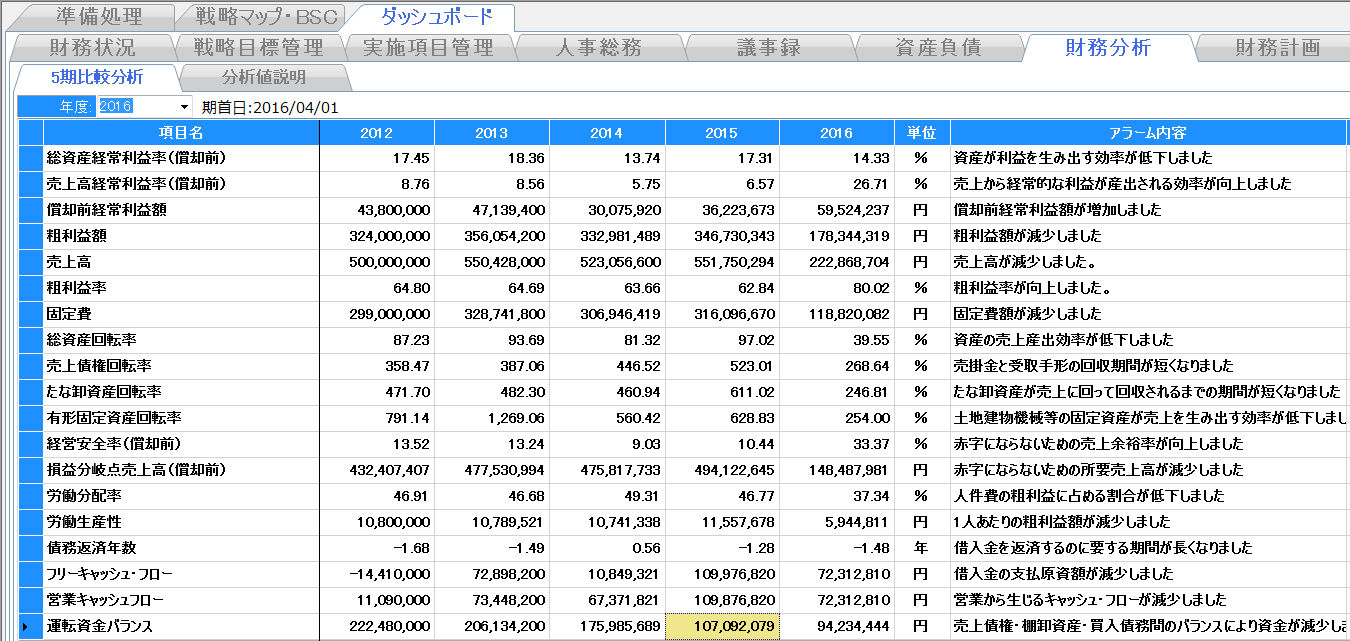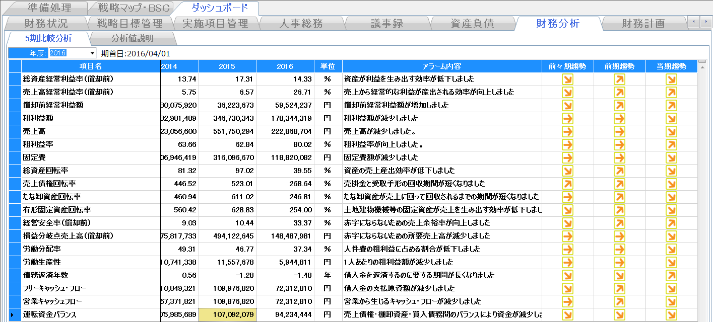 5期分の財務分析値等の推移とアラーム内容が表示されます。アラーム内容には、5期分の推移を分析した結果、検討すべき内容が表示されています。