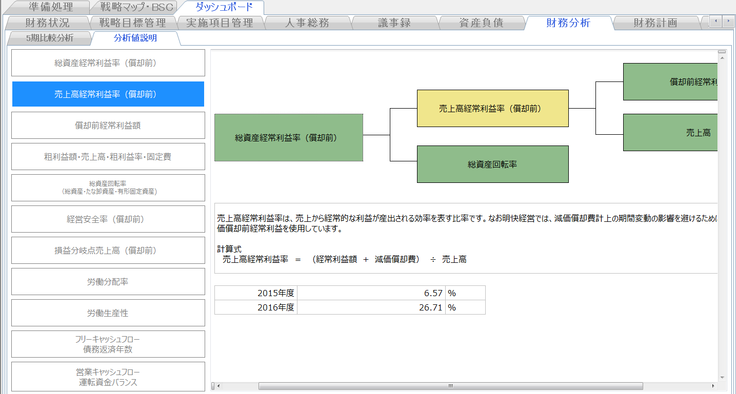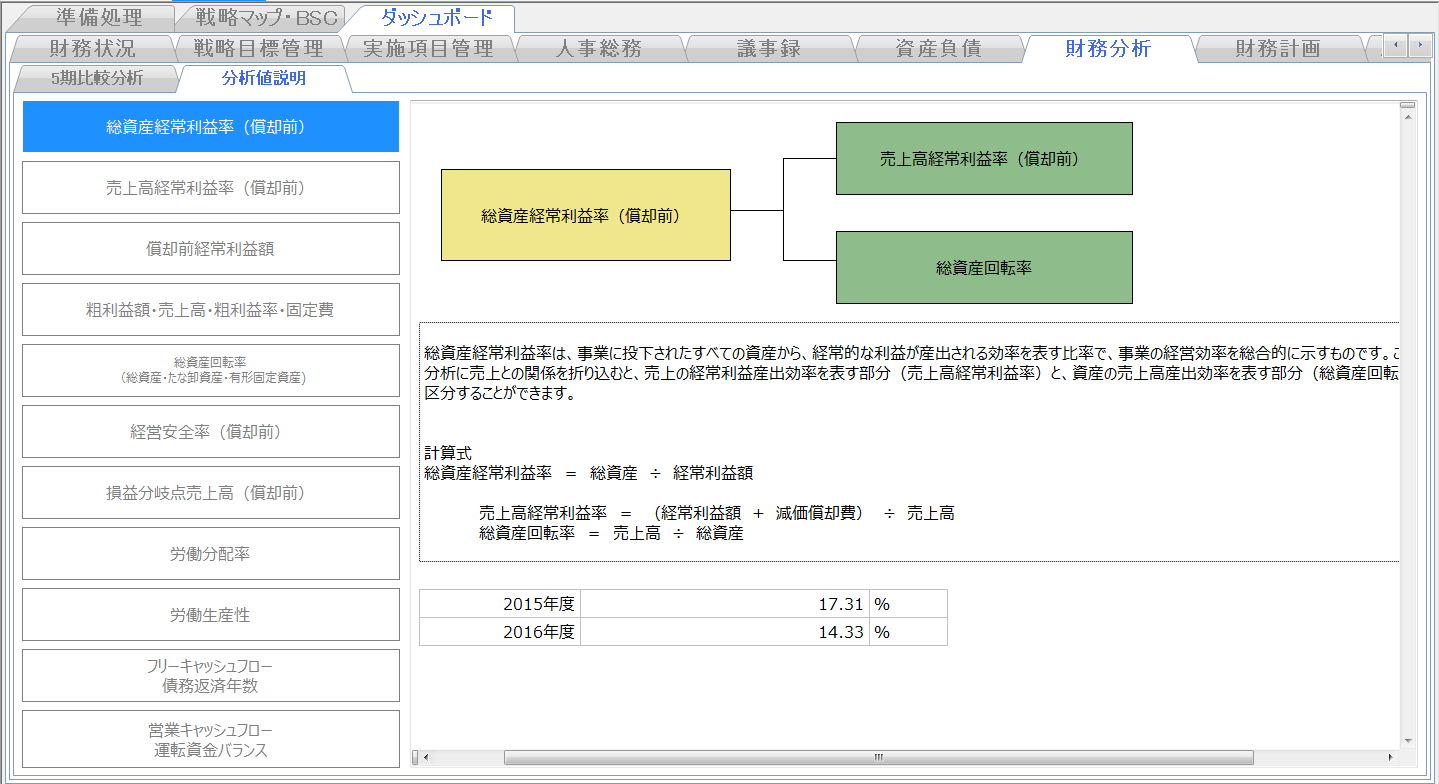 画面右側では財務分析指数等の推移を表示しています。こちらで経営状況の推移を把握しましょう。
