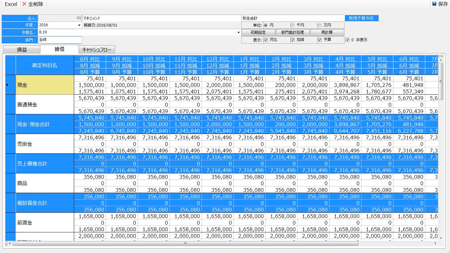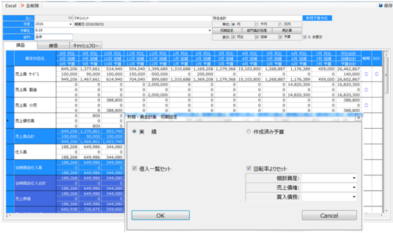 資金計画も同様に、過去の財務データをもとに、貸借対照表の比率を増減させ、簡単に予算の作成ができます。