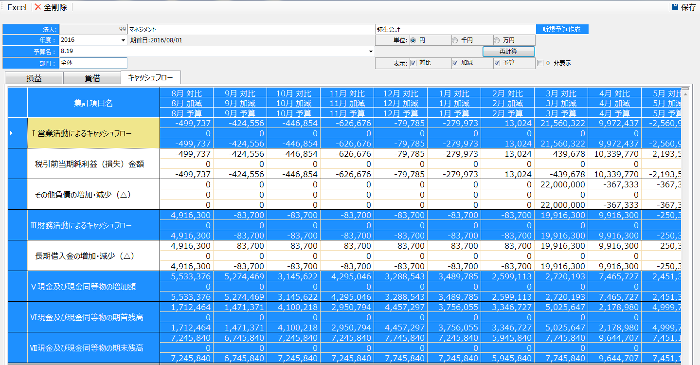 毎月取り込む会計データから、月次キャッシュフロー計算書を作成します。年間キャッシュフローだけではなく、月次キャッシュフローも検討し、タイムリーに資金の流れを