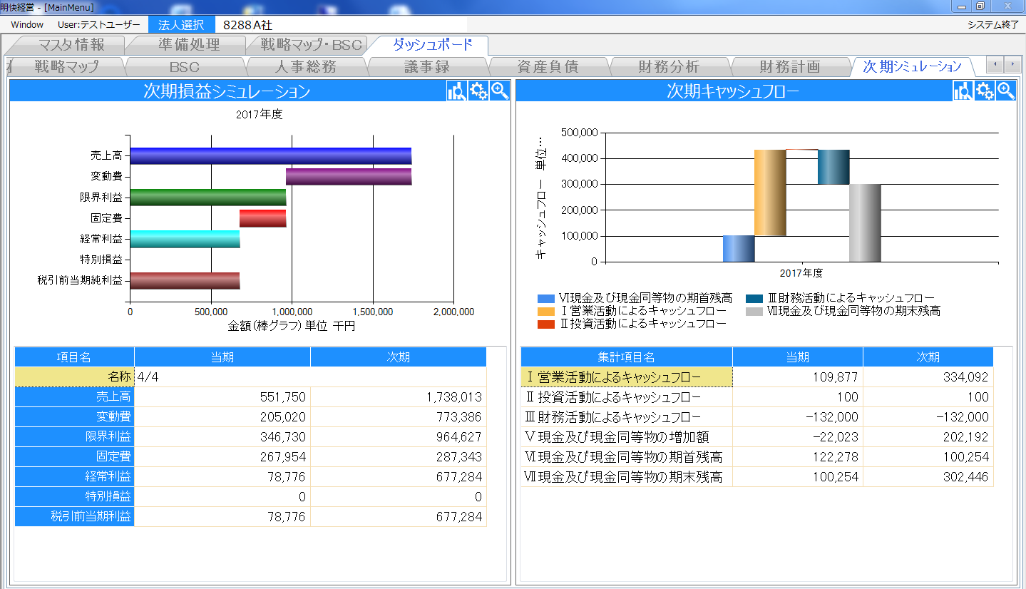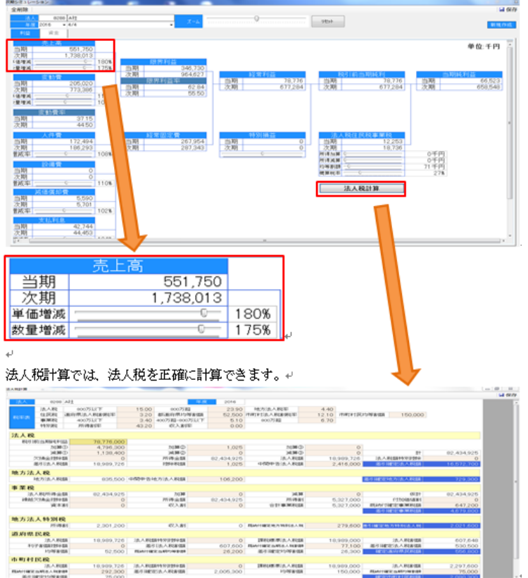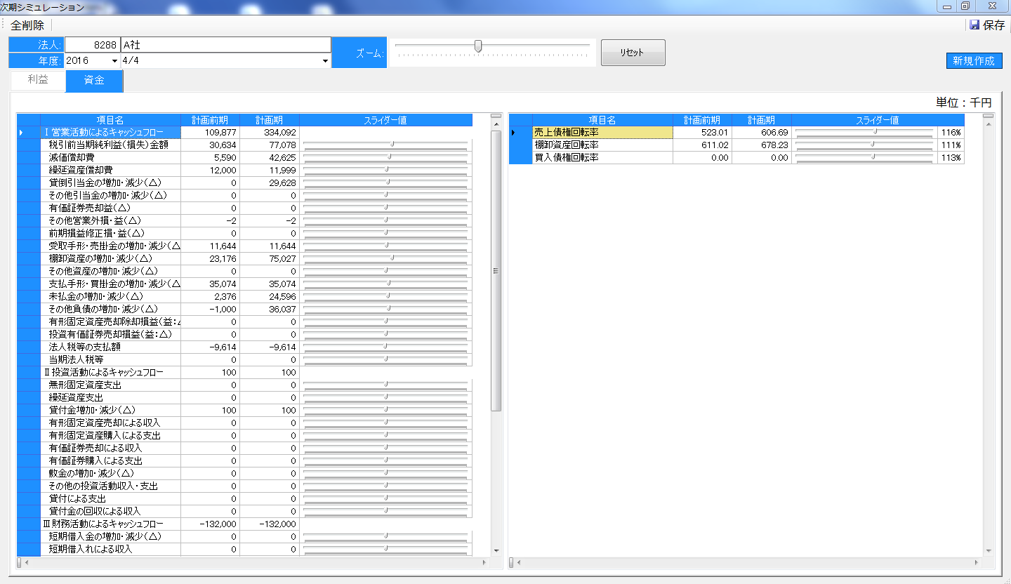 増減率のスライダーを調整することにより、簡単に次期の損益・資金のシミュレーションできます。