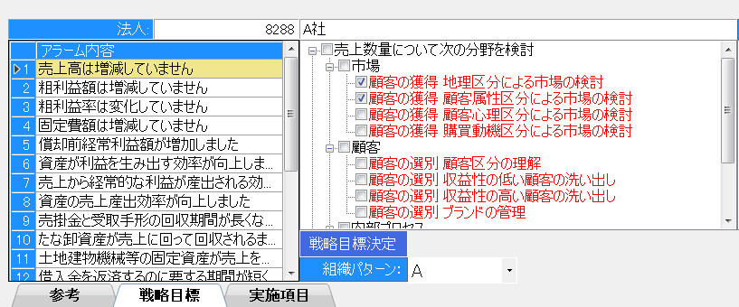財務分析で抽出された経営上の問題点をアラームとして表示し、アラームに対応する具体的経営改善策を提示しますので、その会社に適した年間の具体的経営改善策を簡単に組み立てることができます。
