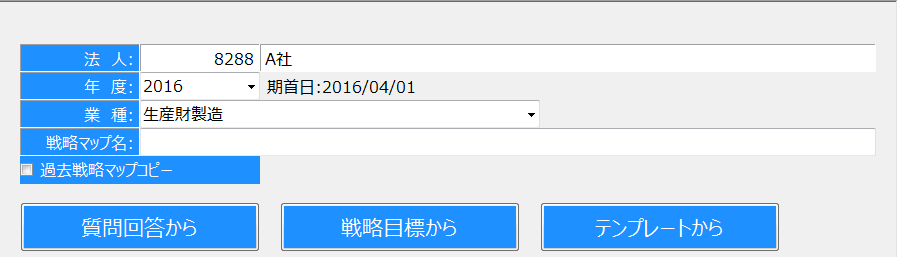 戦略マップを作成する年度、業種、戦略マップ名を入力してください。「質問回答から」、「全戦略マップから」、「テンプレート」のうち、どれか1つを選択して作成しましょう。