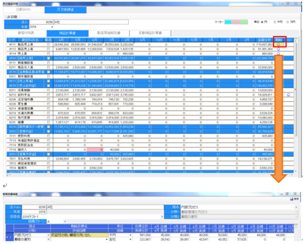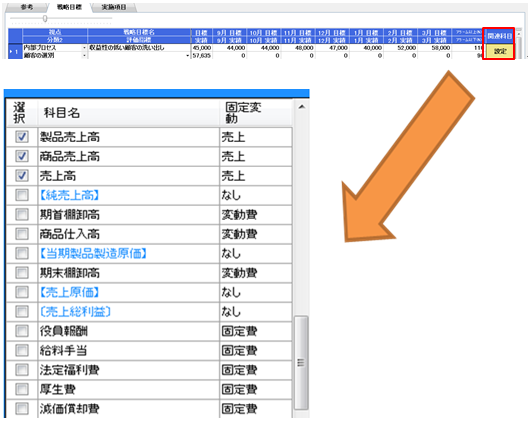 関連科目設定後に、ダッシュボードの月次決算を開くと、設定した勘定科目の戦略に〇がつきます。〇をクリックすることで、戦略目標を確認できます。