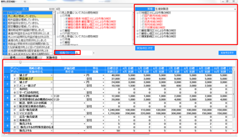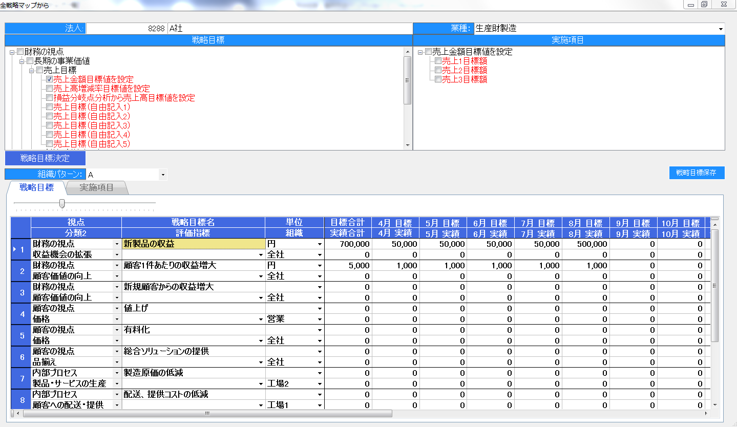 戦略目標と実施項目は、準備処理で法人別組織図を複数作成している場合には、組織パターンを選択することで、組織図ごとにそれぞれ戦略目標と実施項目を作成できます。