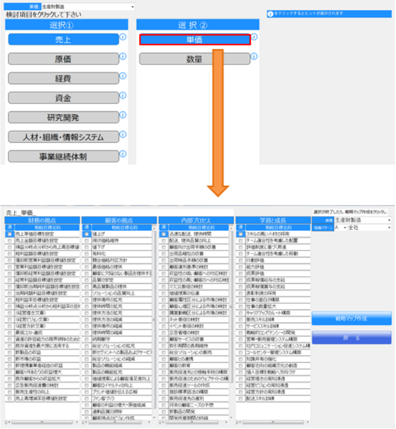 戦略目標からをクリックすると、BSCの4つの視点(財務、顧客、内部プロセス、学習と成長)ごとの戦略目標が表示されますので、採用したい戦略目標にチェックをつけて戦略マップを作成できます。