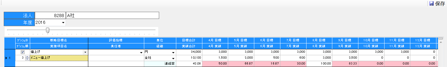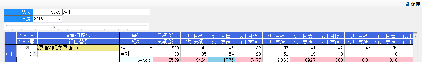 また、ダッシュ Bとダッシュ順の入力をすることで、ダッシュボードで戦略目標の目標値と実績値をグラフ化したものが表示されます。