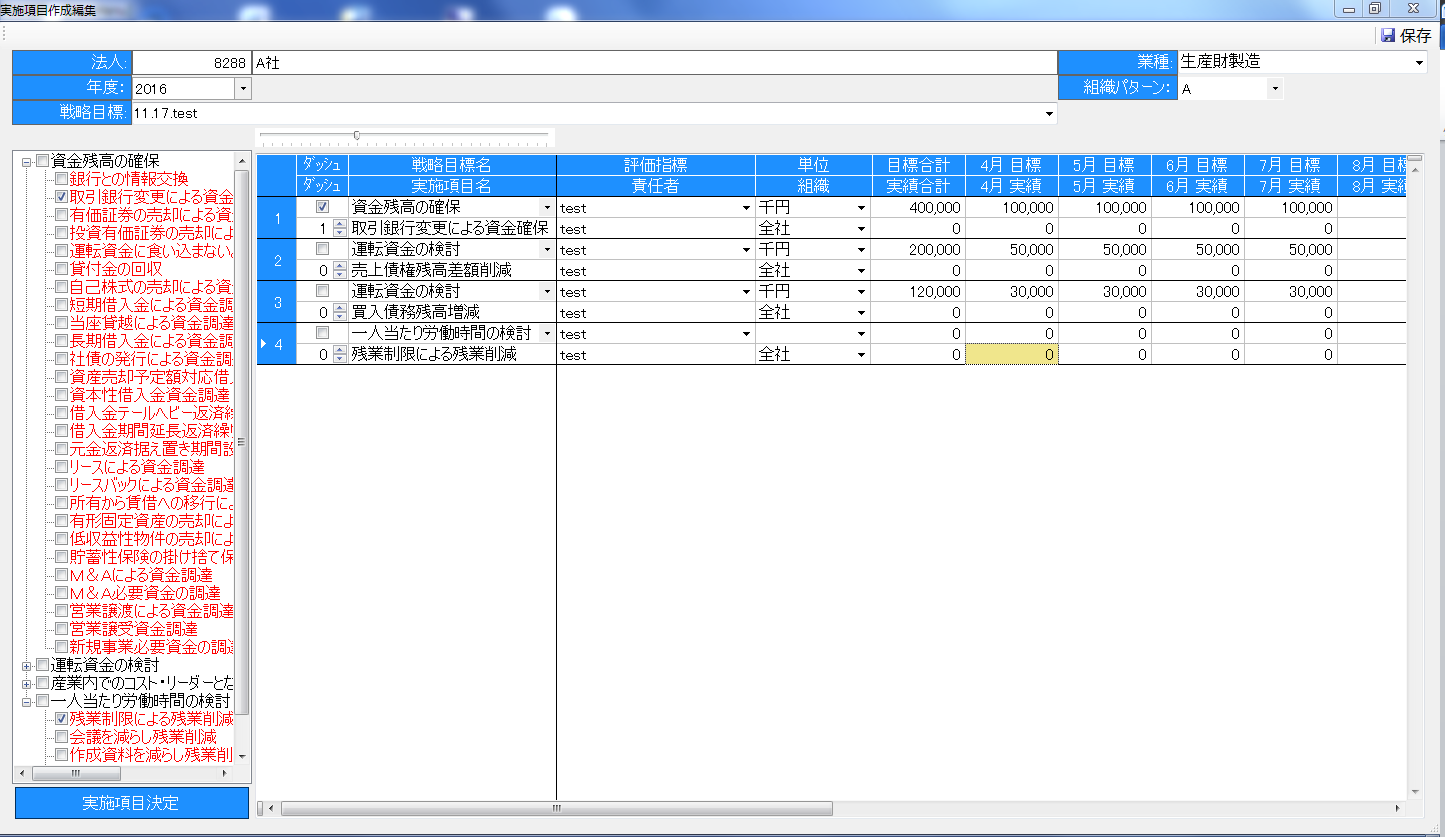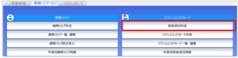 ここで表示される実施項目は、バランススコアカード作成で作成した実施項目と戦略マップ作成時に作成した実施項目が表示されます。実施項目を新たに作成したい場合には、バランススコアカード作成等で再度実施項目を作成しましょう。