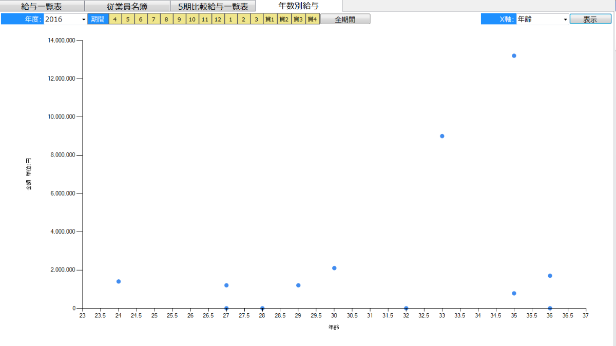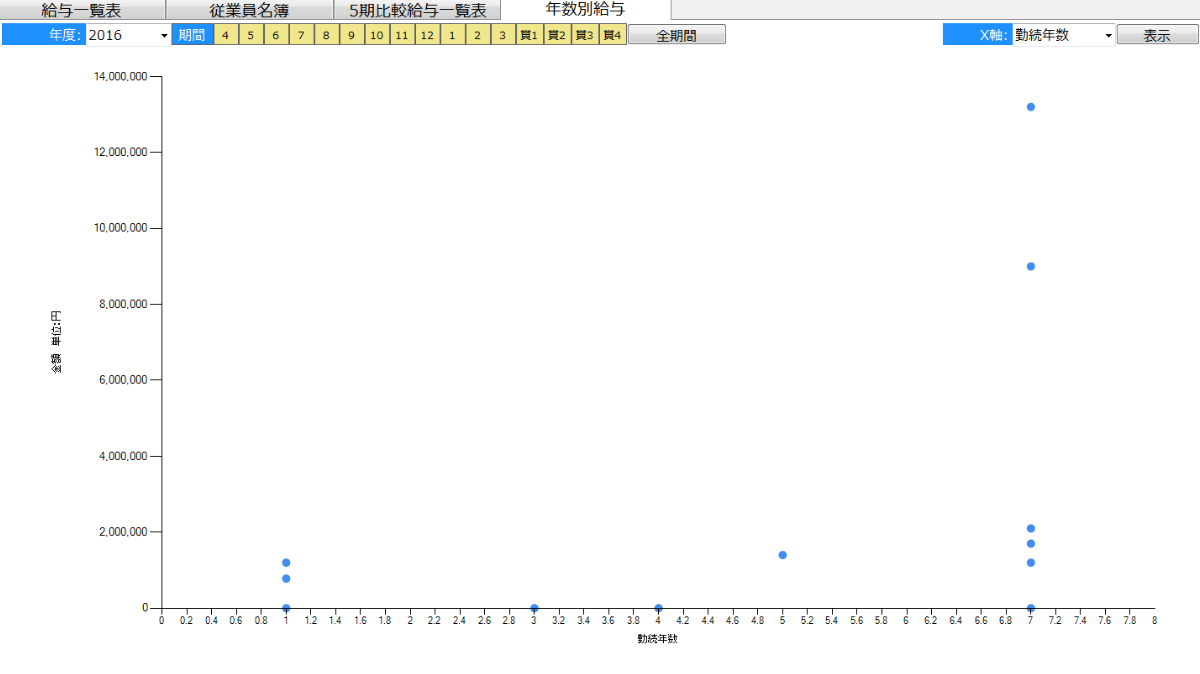 年度毎にX軸を年齢もしくは勤続年数を選択することで、給与の散布図が表示されます。